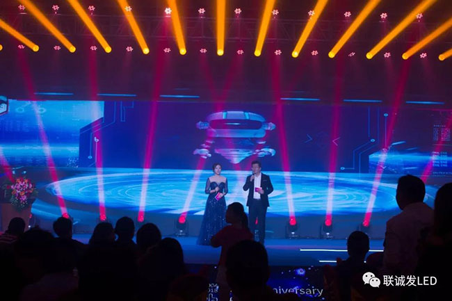 灯光聚焦、星光熠熠,开场舞《水世界》点燃了整场晚会的气氛,拉开了庆典的序幕,LED黑科技主持穿越光影时空,模拟米兰milan吉祥物“帅帅”讲话,与会人员无不震撼,整个会场弥漫着让人感动的力量和温情。